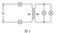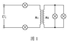 如图1所示,电路中有四个完全相同的灯泡,额定电压均为U,额定功率均为P,变压器为理想变压器,现在四个灯泡都正常发光,则变压器的匝数比n1∶n2和电源电压U1分别为 ( )![]()