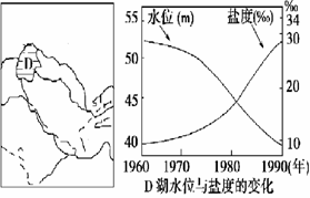 (2)俄罗斯将鄂毕河河水引入咸海的原因之一是咸海面积在不继缩小。试分析咸海面积缩小的原因?为减缓D湖生态恶化、水量减少的趋势,应采取的措施。(3+2分)
