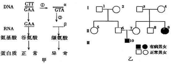 43.下图甲表示人类镰刀型细胞贫血症的病因,乙是在一个家族中该病的遗传系谱图(控制基因用B、b)。已知谷氨酸的密码子是GAA、GAG,请根据图回答下面的问题。