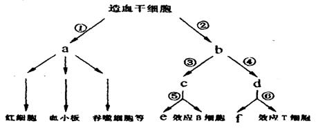 (7分)下图表示表示人体内各类血细胞生成的途径。a-f表示不同种类的细胞.①-⑥表示有关过程。