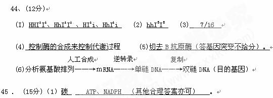 44、(12分)根据人类ABO血型系统,人类的血型可分为A型、B型、AB型、O型4种,其分类的主要依据是红细胞表面的抗原种类。红细胞表面仅含A抗原的为A型,仅含B抗原的为B型,同时含A、B抗原的为AB型、O型者红细胞则不含2种抗原,但通常含有可以形成A、B抗原的物质H(无H者也被视为O型)。上述抗原的形成由2对基因控制,这2对基因分别位于2对同源染色体上,其中基因H编码的酶能促使前体物质转变为物质H,但它的等位h则不能编码这种酶,基因IA能编码的酶能促使H转变为A抗原,基因IB编码的酶能促使H转变为B抗原,但它们的等位基因i则不能编码这2种酶。根据A抗原、B抗原以及它们的前体物质之间的关系。请分析回答下列问题