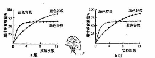 16.警戒色是某些有毒的或不可食的生物所具有的鲜艳醒目的颜色,这种颜色往往会对捕食 者形成信号作用,使其避而远之。某研究小组进行了与警戒色有关的模拟实验:让a、b 两组小鸡分别在不同颜色的地板上啄食均为苦味的谷粒,并对啄食情况进行统计,结果 如下图所示。