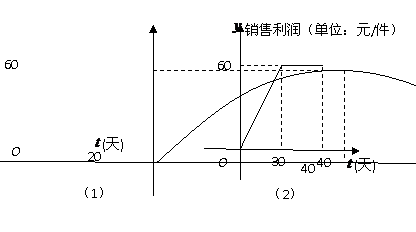 上市后的市场销售进行调研,结果如图(1)、(2)所示.其中(1)的抛物线表示的是市场的日销售量与上市时间的关系;(2)的折线表示的是每件产品