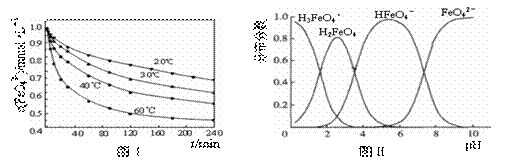 (2)将适量K2FeO4溶解于pH=4.74的溶液中,配制成c(FeO42-) =1.0 mmol·L-1的试样,将试样分别置于20℃、30℃、40℃和60℃的恒温水浴中,测定c(FeO42-)的变化,结果见图Ⅰ。该实验的目的是 ;发生反应的△H 0(填“>”、“<”或“=”)。