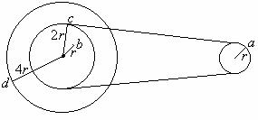 例题:如图所示一皮带轮传动装置,右轮半径为r,a是它边缘上的一点。左侧是一轮轴,大轮的半径为4r,小轮半径为2r,b点在小轮上,到小轮中心距离为r,c点和d点分别位于小轮和大轮的边缘上,若在传动过程中,皮带不打滑,则
