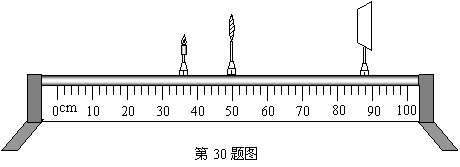 30.如图所示,是探究凸透镜成像规律的实验装置,其中蜡烛已被点燃,凸透镜的焦距是10cm。在做实验之前,你觉得光具座上的蜡烛应再调 一些(高或低)。小刚同学将实验装置调整好后。将蜡烛放在20cm的刻线处,凸透镜放在50cm的刻线处,通过移动光屏,可得到清晰 倒立实像。(2分)