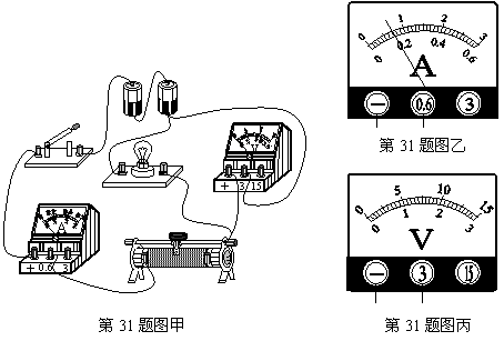 31.用电流表和电压表测2.5V小灯泡额定功率。实验电路如图甲所示。闭合开关,调节滑动变阻器滑片,当小灯泡正常发光时,电流表示数如图乙所示。(3分)