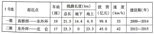 28.(09宁波)轨道交通具有便捷、运量大、污染低、安全性高等优点,有利于减缓城市交通拥挤、减少汽车尾气排放等。宁波市轨道交通工程l号线已开始建设,其部分信息如下表所示: