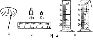 ⑶用调节好的天平称小矿石的质量.天平平衡时,放在右盘中的砝码和游码的位置如图14乙所示;量筒量出小矿石的体积如图14丙所示,由此可知,小矿石的密度ρ= kg/m3.