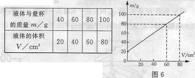 9.(09烟台)小明利用天平和量杯测量某种液体的密度,得到的数据如下表,根据数据绘出的图象如图6所示.则量杯的质量与液体的密度是