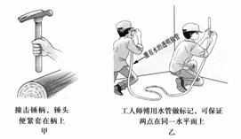 (09兰州 ). 如图所示,锤头松动时,用力敲锤柄是利用 使锤头套紧;许多机器的轴上都装了滚动轴承,这是因为在压力相同的情况下 。