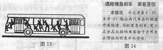 20.(09烟台)在乘坐公交车时,我们常常会遇到图13所示的情景.报纸、电视、网络等新闻媒体也经常从不同角度对此类事情进行过报道(图14).为了避免这种情况的发生,保证乘客的安全,现在公交车上的语音提示系统会自动提醒大家:“上车的乘客请扶好站稳”.
