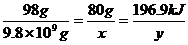 (5)1万吨98%的硫酸含H2SO4的质量:9.8×109g。 设需要SO3的质量为x,该反应产生的热量为y。