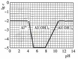 ①用NaOH溶液调节(2)中溶液pH至7,该过程中发生反应的离子方程式有 ②请在答题卡的框图中,画出0.01mol·l-1NH4Al(SO4)2溶液中铝各形态的浓度的对数lgc随溶液pH变化的关系图,并进行必要的标注。