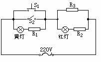 如图所示是电饭煲的电路图,S1是一个限温开关,手动闭合,当此开关的温度达到居里点(103℃)时会自动断开;S2是一个自动温控开关,当温度低于60℃时会自动闭合,温度高于80℃时会自动断开,红灯是加热状态时的指示灯,它在保温状态下是不亮的,黄灯是保温状态下的指示灯。限流电阻R1=R2=500Ω,加热电阻丝R3=50Ω,两灯的电阻不计。