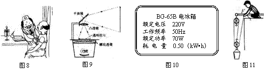 17.如图10是一台电冰箱的铭牌. 其中,“耗电量0.50(kW•h)/24h”这个参数的含义是,该冰箱正常使用24h消耗的电能为 . 如果按照额定功率70W和工作24h计算,则消耗的电能是 kW•h,这个计算结果与冰箱铭牌上提供的相关参数差异较大,是由于冰箱具有 工作的特点而造成的.