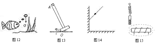 如图13所示,使用羊角锤拔钉子,动力作用在锤柄上A点. 请作出拔钉子时所用最小动力F的示意图. (注意:请在图上保留为确保作图准确所画的辅助线)