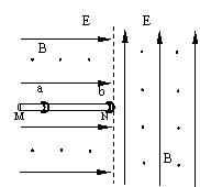 如图所示,在虚线左右两侧均有磁感应强度相同的垂直纸面向外的匀强磁场和场强大小相等方向不同的匀强电场,虚线左侧电场方向水平向右,虚线右侧电场方向竖直向上。左侧电场中有一根足够长的固定绝缘细杆MN,N端位于两电场的交界线上。a、b是两个质量相同的小环(环的半径略大于杆的半径),a环带电,b环不带电,b环套在杆上的N端且处于静止,将a环套在杆上的M端由静止释放,a环先加速后匀速运动到N端,a环与b环在N端碰撞并粘在一起,随即进入右侧场区做半径为 r = 0.10 m的匀速圆周运动,然后两环由虚线上的P点进入左侧场区。已知a环与细杆MN的动摩擦因数μ=0.20,取g = 10 m/s2。求: