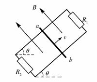 20.如图所示,平行金属导轨与水平面成θ角,导轨与固定电阻R1和R2相连,匀强磁场垂直穿过导轨平面。有一导体棒ab,质量为m,导体棒的电阻与固定电阻R1和R2的阻值均相等,与导轨之间的动摩擦因数为μ,导体棒ab沿导轨向上滑动,当上滑的速度为v时,导体棒受到的安培力的大小为F,此时