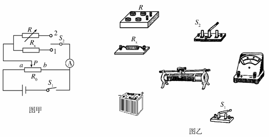 (3)用替代法测一个未知电阻Rx(约500Ω)的阻值,可以用如图甲所示的电路。图中R为电阻箱,S2为单刀双掷开关,R0为滑动变阻器,其最大阻值为20Ω。
