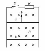 24.(20分)如图所示,在磁感应强度为B的水平方向的匀强磁场中竖直放置两平行导轨,磁场方向与导轨所在平面垂直。导轨上端跨接一阻值为R的电阻(导轨电阻不计)。两金属棒a和b的电阻均为R,质量分别为ma=2×10-2Kg和mb=1×10-2Kg,它们与导轨相连,并可沿导轨无摩擦滑动。闭合开关S,先固定b,用一恒力F向上拉a,稳定后a以v1=10m/s的速度匀速运动,此时再释放b,b恰好能保持静止,设导轨足够长,取g=10m/s2。