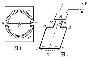 接入图中装置A,在线框转动的过程中,装置A能使端点M始终与P相连,而端点N始终与Q相连。现使转子以ω=200π rad/s的角速度匀速转动。在图1中看,转动方向是顺时针的,设线框经过图1位置时t = 0。(取π = 3)