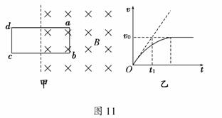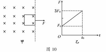 10.(11分)(2010·常州模拟)如图10甲所示,一正方形金属线框位于有界匀强磁场区域内,线框的右边紧贴着边界.t=0时刻对线框施加一水平向右的外力F,让线框从静止开始做匀加速直线运动,经过时间t0穿出磁场.图10乙所示为外力F随时间t变化的图象.若线框质量为m、电阻R及图象中的F0、t0均为已知量,则根据上述条件,请你推出:
