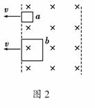如图2所示,用粗细相同的铜丝做成边长分别为L和2L的两只闭合线框a和b,以相同的速度从磁感应强度为B的匀强磁场区域中匀速地拉到磁场外,不考虑线框的动能,若外力对环做的功分别为Wa、Wb,则Wa∶Wb为