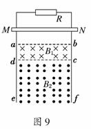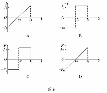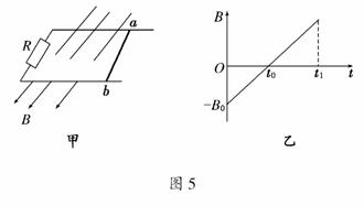 5.(2010·扬州模拟)如图5甲所示,光滑导轨水平放置在与水平方向夹角为60°的斜向下的匀强磁场中,匀强磁场的磁感应强度B随时间t的变化规律如图5乙所示(规定斜向下为正方向),导体棒ab垂直导轨放置,除电阻R的阻值外,其余电阻不计,导体棒ab在水平外力F作用下始终处于静止状态.规定a→b的方向为电流的正方向,水平向右的方向为外力F的正方向,则在0-t1时间内,图6中能正确反映流过导体棒ab的电流i和导体棒ab所受水平外力F随时间t变化的图象是 ( )