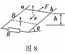 如图8所示的电路中,两根光滑金属导轨平行放置在倾角为θ的斜面上,导轨下端接有电阻R,导轨电阻不计,斜面处在竖直向上的磁感应强度为B的匀强磁场中,电阻可略去不计的金属棒ab质量为m,受到沿斜面向上且与金属棒垂直的恒力F的作用,金属棒沿导轨匀速下滑,则它在下滑h高度的过程中,以下说法正确的是