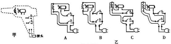 2、如图所示,有带风叶的小电动机一台,电热丝一段,开关两只,插头一只,导线若干。利用这些器材可以连接成一个有冷、热两档风的简易电吹风电路。要求在使用时。只要断开S1,则既无风也不发热;只闭合S1时吹冷风;闭合S1和S2时吹热风。图一是某物理兴趣小组的四位同学分别设计的四种电路连接图,其中符合要求的是( )