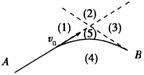 5.(07宁厦中卫)一个物体以初速度v0从A点开始在光滑水平面上运动,一个水平力作用在物体上,物体运动轨迹为图中实线所示.图中B为轨迹上的一点,虚线是过A、B两点并与该轨迹相切的直线,虚线和实线将水平面划分为图示的5个区域,则关于施力物体位置的判断,下面说法中正确的是 ( )