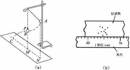 如图(a)中,悬点正下方P点处放有水平放置炽热的电热丝,当悬线摆至电热丝处时能轻易被烧断,小球由于惯性向前飞出作平抛运动.在地面上放上白纸,上面覆盖着复写纸,当小球落在复写纸上时,会在下面白纸上留下痕迹.用重锤线确定出A、B点的投影点N、M.重复实验10次(小球每一次都从同一点由静止释放),球的落点痕迹如图(b)所示,图中米尺水平放置,零刻度线与M点对齐.用米尺量出AN的高度h1、BM的高度h2,算出A、B两点的竖直距离,再量出M、C之间的距离x,即可验证机械能守恒定律.已知重力加速度为g,小球的质量为m.