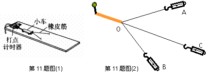 (2)某同学在做验证互成角度的两力合成的平行四边形定则的实验时,把橡皮条一端固定,另一端用A、B两个弹簧秤同时拉着到达O点位置,此时两弹簧秤的读数分别是FA=3.41 N和FB=4.18N,其位置记录如图(2)所示.倘若橡皮绳的活动端仅由一个弹簧秤拉着,也把它拉到O点位置,读得弹簧秤的读数为FC=6.14 N,其位置如C.以1 cm表示1N,作力的图示,用作图法求出FA、FB的合力大小(要说明量值)、和方向(只要图示),并说明该实验的结论.