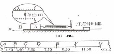 (2)该同学还设计性地将纸带连接在金属板B的后面,通过打点计时器连续打下一些计时点,取时间间隔为0.1s 的几点,测量后结果如图(b)所示,则金属板被拉动的加速度