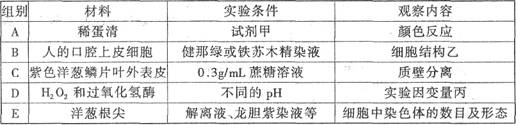 (2)A组实验所用的试剂甲是 ,观察到颜色是 。B组实验观察的细胞结构乙是 。在D组实验中,实验因变量丙是 。
