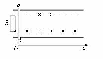 11、如图所示,质量为m的跨接杆ab可以无摩擦地沿水平的导轨滑行,两轨间距为L,导轨一端与电阻R连接,放在竖直向下的匀强磁场中,磁感应强度为B。杆从x轴原点O以大小为v0的水平初速度向右滑行,直到停下。已知杆在整个运动过程中速度v和位移x的函数关系是:v=v0-。杆与导轨的电阻不计。