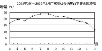 ②产生这种经济现象的原因:一方面,由于广东省经济总量不断增长,使得2008年3月至8月社会消费品零售额增幅整体走高;另一方面,进入9月以后,社会消费品零售额增幅整出现明显的下滑,主要是受金融危机影响。同时,也是受我省长期以来存在的不合理的城乡收入差距、分配体制等多种因素综合影响的结果。