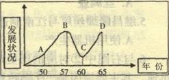 29.右图反映的是中国二十世纪五六十年代国民经济发展的状况。出现图中c点到D点这一变化的主要原因是