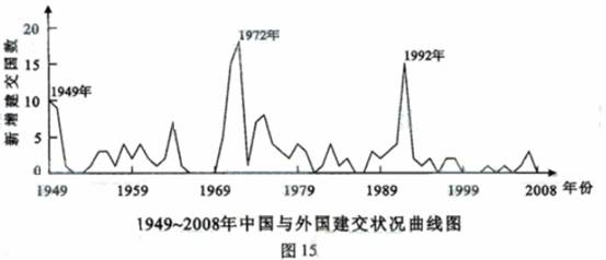 (2)中华人民共和国成立以来 ,形成了1949年、1972年和1992年三次与外国建交的高峰(见图15)。请从中任选一次,指出促成该次建交高峰的国内外因素。(8分)