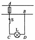 如图所示,闭合电键S后,发现电灯L不亮,且保险丝没有熔断。某同学用测电笔测试灯头的两根电线C,D,发现这两处都能使测电笔的氖管发光,再用测电笔测试火线A和零线B时,氖管在测火线A时能发光,在测零线B时不发光。那么可以判定故障是 ( )
