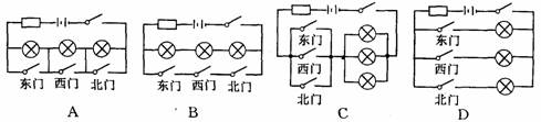 小施学校的教学楼有东、南、西、北四扇大门,放学后要求都要将门关上。平时传达室的蒋师傅住在南门,每天都要跑三个地方检查门是否关上,非常辛苦。小施学了电学后为减轻蒋师傅的工作量,设计了一电路图,即三个门中只要有门没关好(相当于一个开关断开),则代表该扇门的指示灯就会发光。下列电路图中符合要求的是: