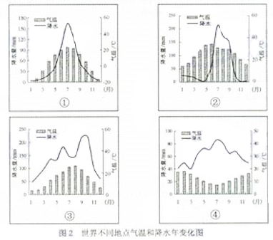 A.①温带海洋气候 ②亚热带季风气候 B. ②热带草原气候④温带季风气候