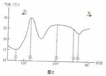 图2是沿36度纬线某月平均气温曲线图,读图回答4-6题。