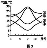 图2中甲地年降水量约为1000 mm,乙地年降水量约为500 mm。图3示意四地气温年内变化。据此完成10-12题。