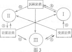 图3为岩石圈物质循环示意图,图中Ⅰ、Ⅱ、Ⅲ分别代表沉积环境、熔融环境和变质环境,箭头线代表不同的地质过程。读图回答5-6题。