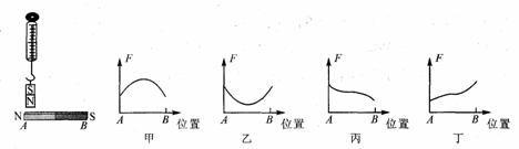 13.如图所示,当弹簧测力计吊着一磁体,沿水平方向从水平放置的条形磁铁的A端移到B端的过程中,能表示测力计示数与水平位置关系的是图中的 ( )