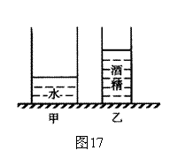 24、如图17所示,两个底面积不同的圆柱形容器甲和乙,容器足够高,分别盛有质量相等的水和酒精(ρ水>ρ酒精),可能使水和酒精对容器底部的压强相等的方法是 ( )