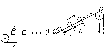 例7:一传送带装置示意图如图,其中传送带经过AB区域时是水平的,经过BC区域时变为圆弧形(圆弧由光滑模板形成,末画出),经过CD区域时是倾斜的,AB和CD都与BC相切。现将大量的质量均为m的小货箱一个一个在A处放到传送带上,放置时初速为零,经传送带运送到D处,D和A的高度差为h。稳定工作时传送带速度不变,CD段上各箱等距排列,相邻两箱的距离为L。每个箱子在A处投放后,在到达B之前已经相对于传送带静止,且以后也不再滑动(忽略经BC段时的微小滑动)。已知在一段相当长的时间T内,共运送小货箱的数目为N。这装置由电动机带动,传送带与轮子间无相对滑动,不计轮轴处的摩擦。求电动机的平均输出功率P。