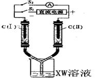 ⑸如图所示装置,两玻璃管中盛满XW溶液,C(Ⅰ)、 C(Ⅱ)为多孔石墨电极。接通S1后,两玻璃管中有气体生成。一段时间后(两玻璃管中液面未脱离电极),断开S1,接通S2,电流表的指针发生偏转。此时: